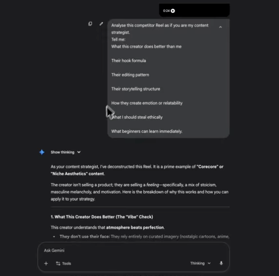 Prompt kiểu: Hãy phân tích như content strategist. Creator này làm tốt hơn tôi ở đâu?