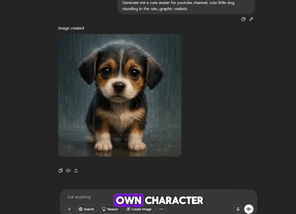 Mở trình duyệt và vào ChatGPT. Nhập yêu cầu tạo avatar cho kênh YouTube, ví dụ: "Tạo một avatar dễ thương cho kênh YouTube. Chú chó nhỏ đứng dưới mưa, đồ họa siêu thực tế."