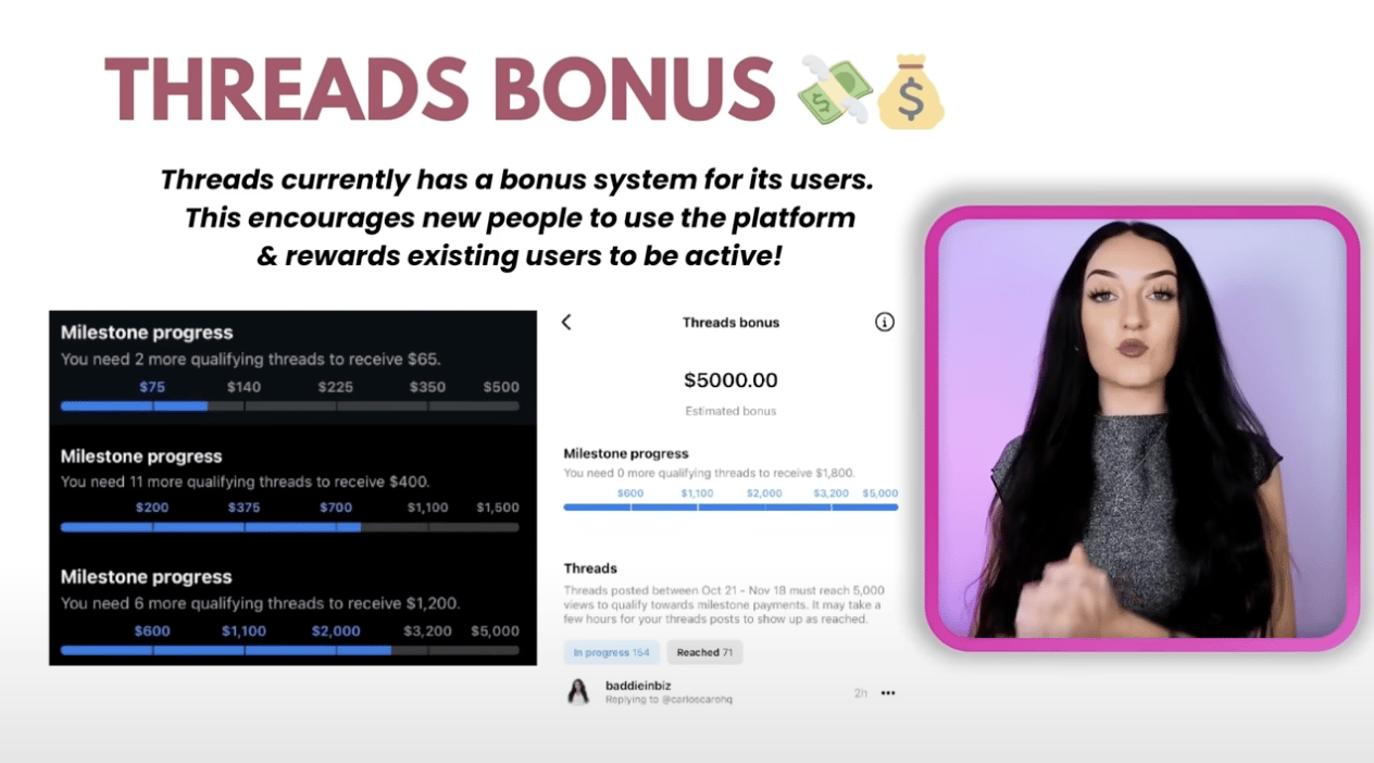 Kiếm tiền từ bonus: Threads có một hệ thống bonus trả tiền cho người dùng nhất quán. Tôi đã nhận được đến 5.000 USD mỗi tháng từ Threads nhờ vào sự nhất quán trong việc tạo nội dung.