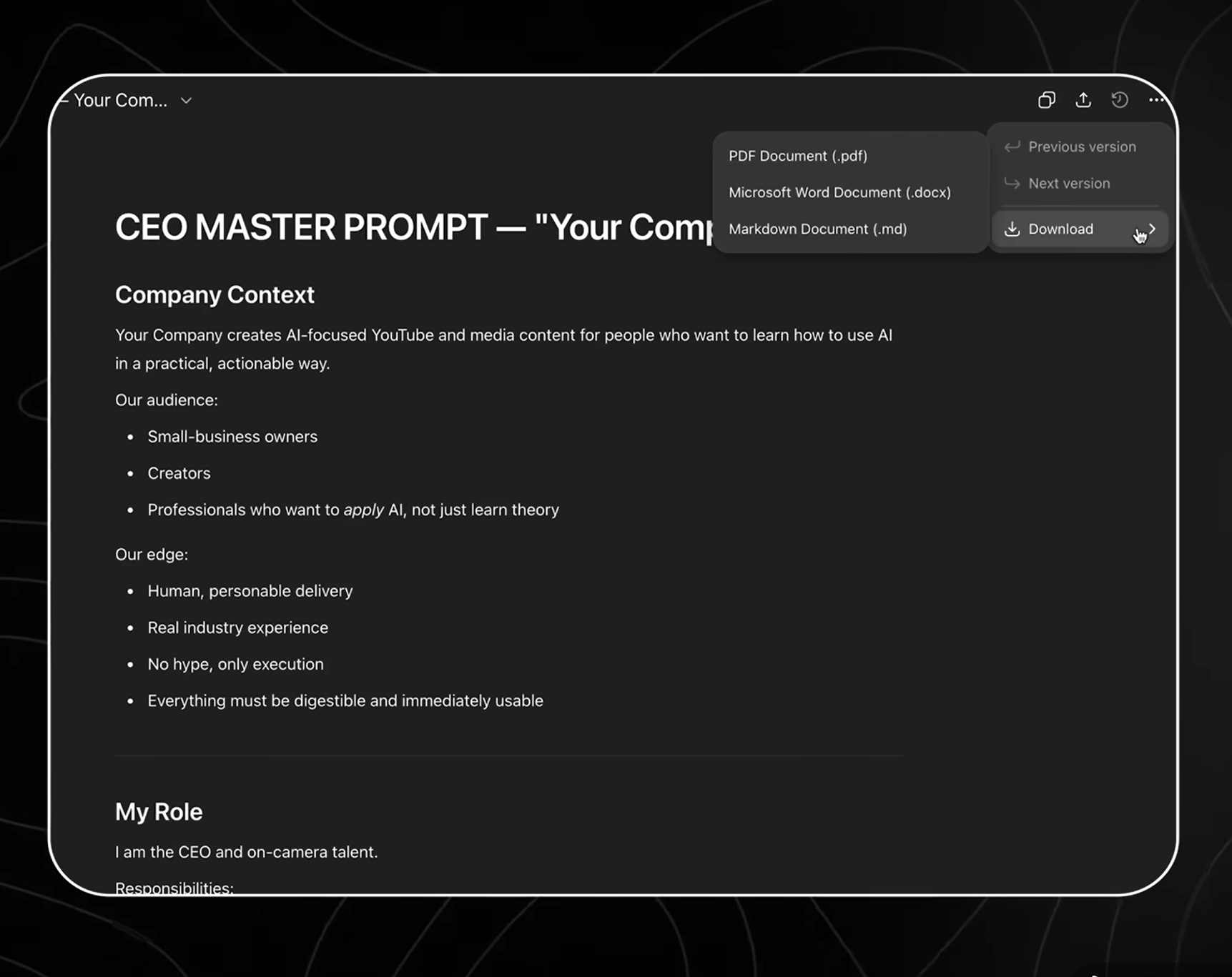 Cách làm: Hãy bảo ChatGPT phỏng vấn bạn: "Hãy phỏng vấn tôi để tạo một Master Prompt cho vai trò CEO của công ty tôi".